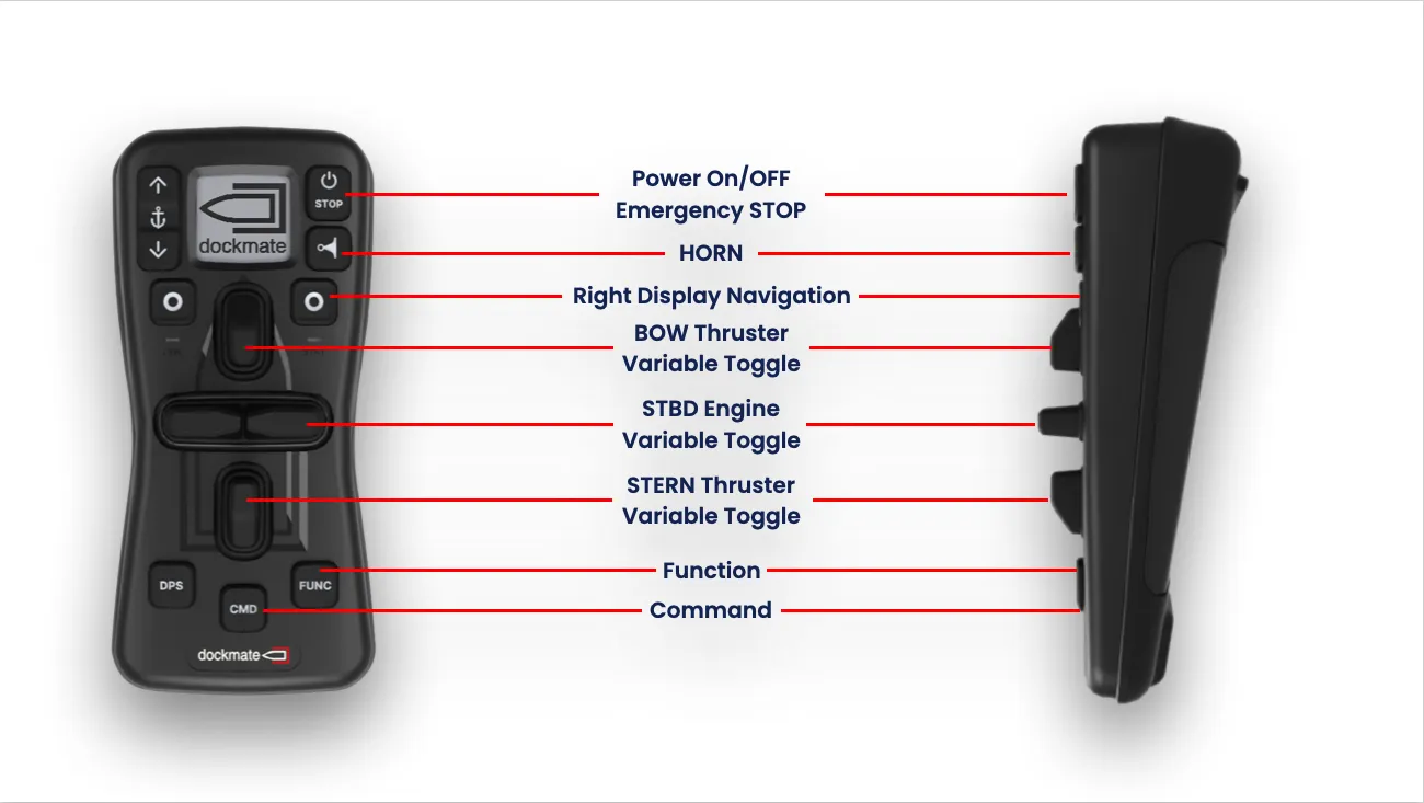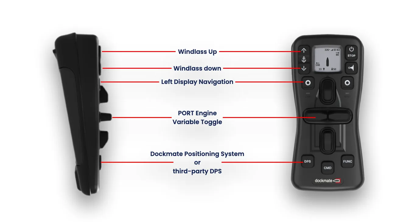 Der Dockmate PRO™ bietet separate Schalter für Motoren und Bugstrahlruder in klassischer Anordnung. Darüber hinaus ermöglichen die variablen Eingangsschalter des Dockmate PRO™ eine präzise Drehzahlregelung der Bootsmotoren und Bugstrahlruder. Dabei bieten sie das gleiche Fahrgefühl und die gleiche Reaktionszeit wie die Steuerung der Bootsmotoren und Bugstrahlruder.