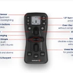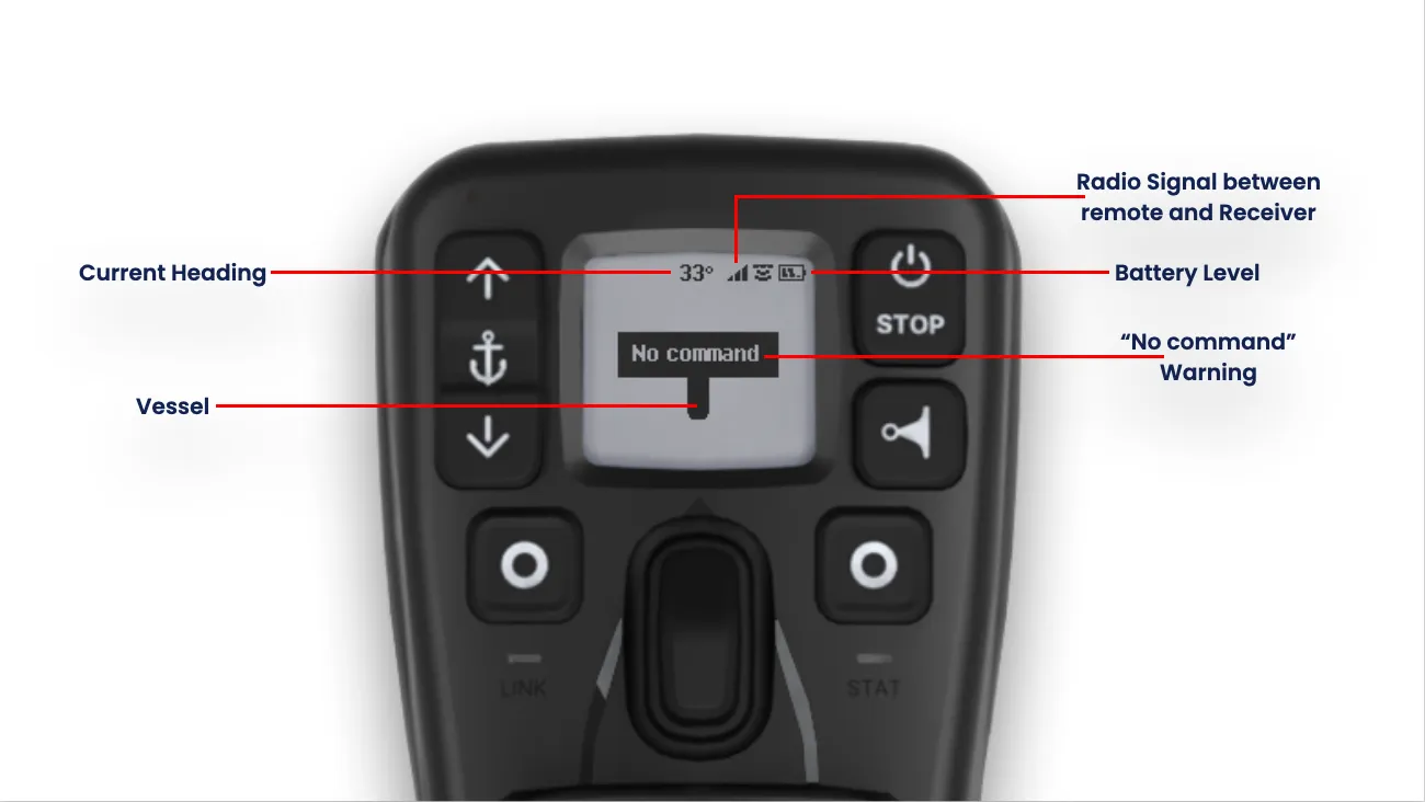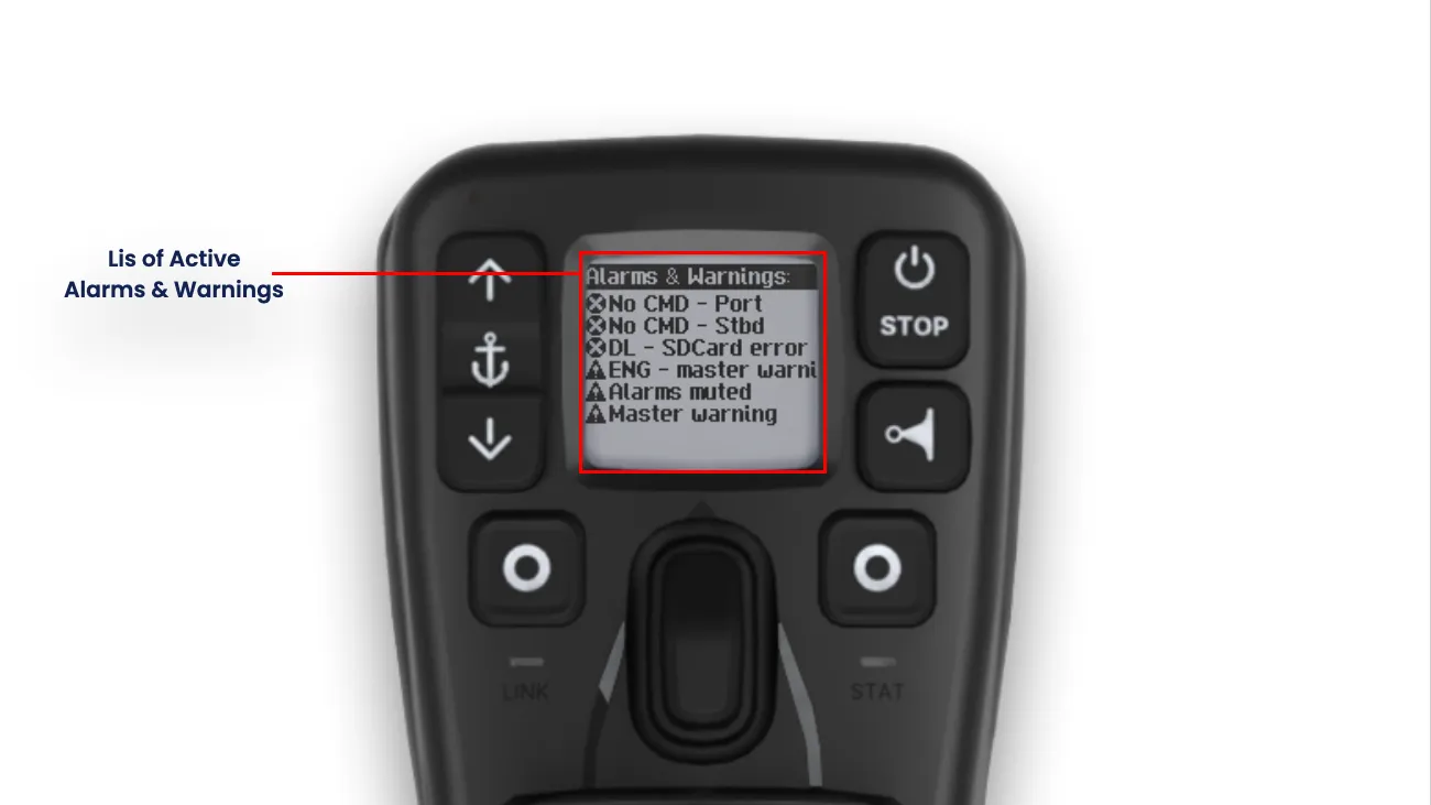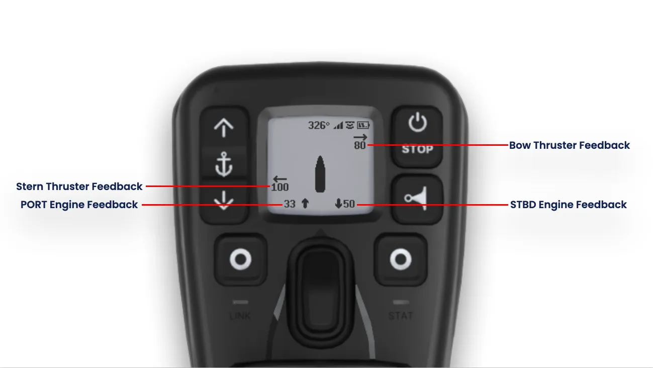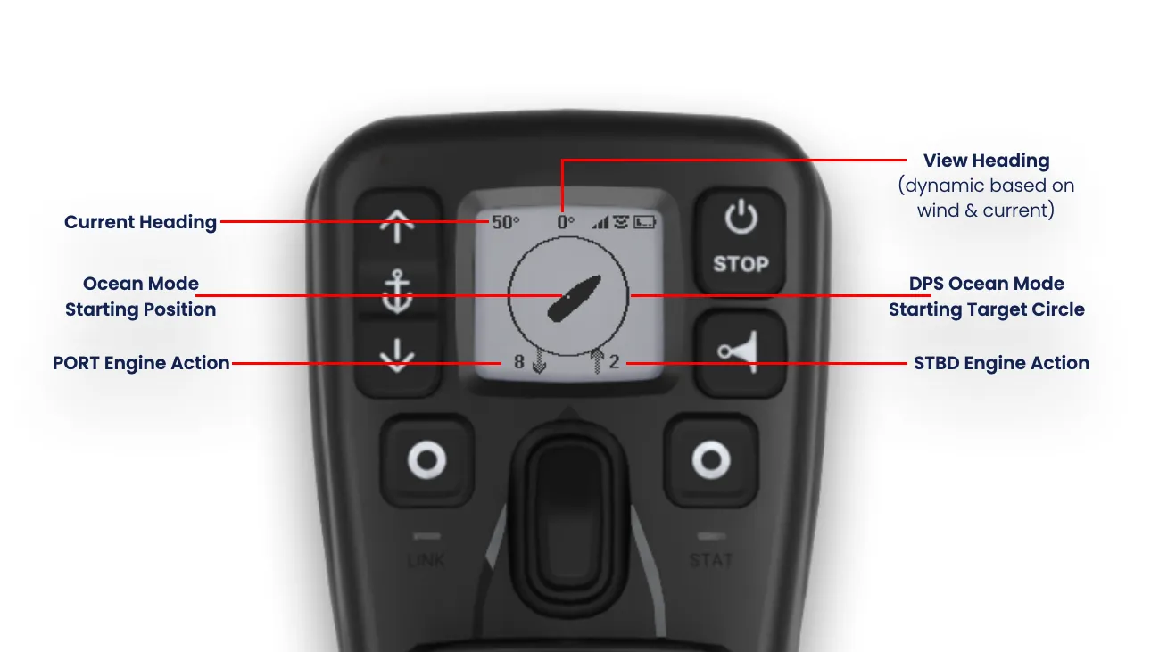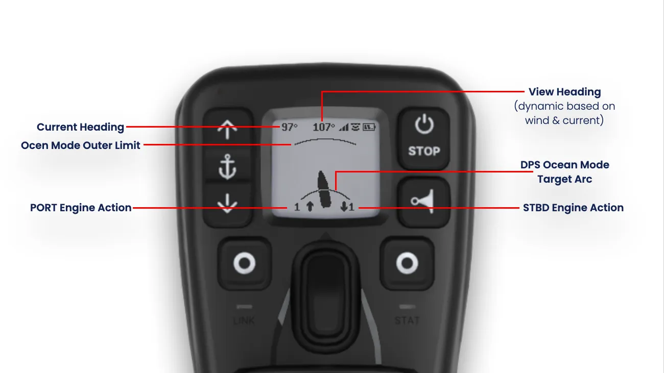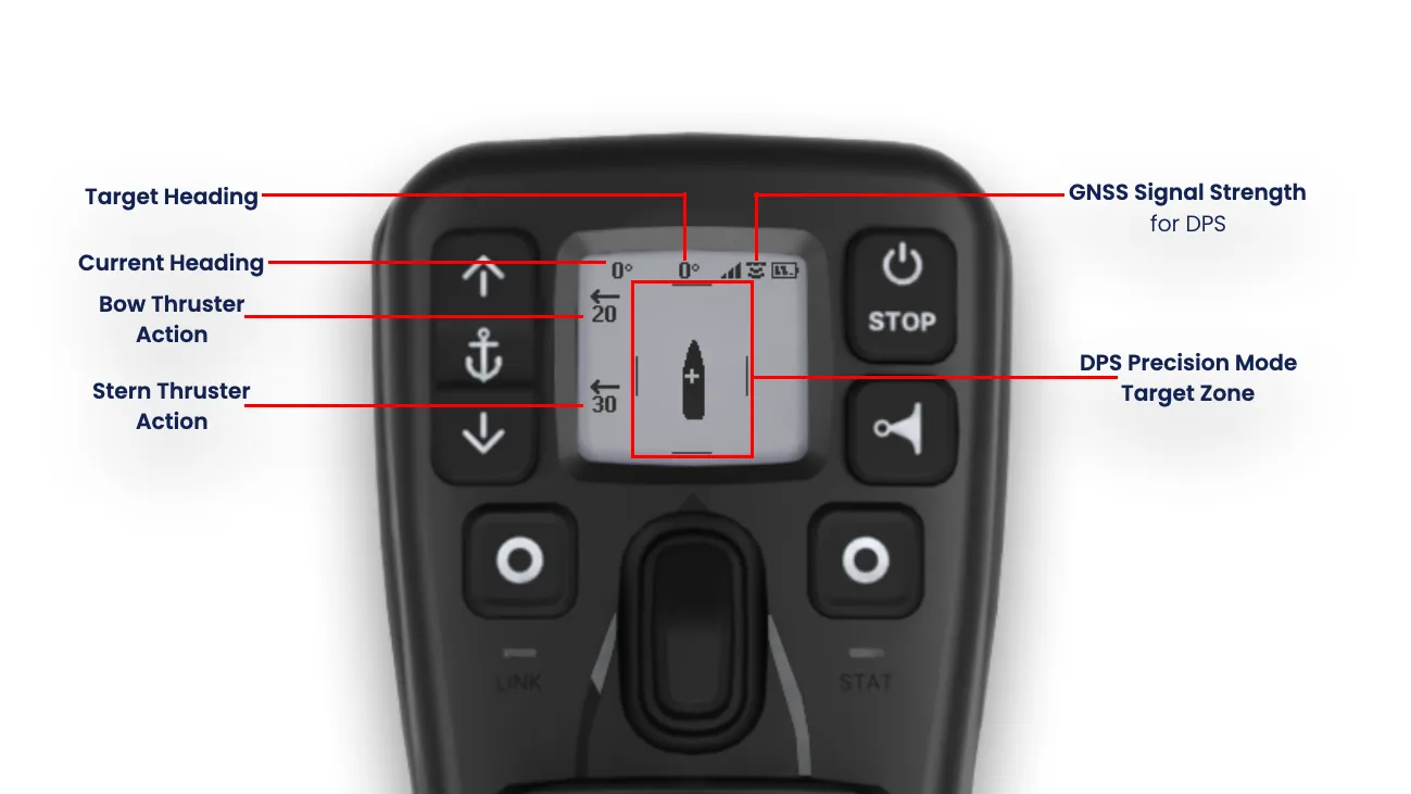 - Das übersichtliche, auch bei Sonneneinstrahlung gut lesbare Display zeigt Benutzerbefehle und Rückmeldungen von Gashebeln, aktiven Modi, aktuellen Einstellungen, der Schiffsposition relativ zur Zielposition (DPS), dem Ladezustand der Fernbatterie, Warnungen und mehr an.
